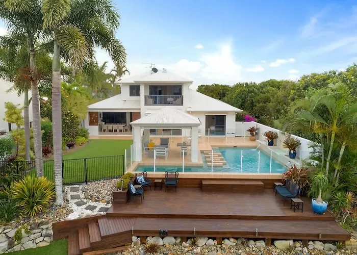 The 3-bedroom Stunning Waterfront Coastal Retreat, Sleeps 13 Villa is located about 10 minutes by car from Aqua Fun Park and boasts a swimming pool provided on a terrace for a pleasant stay. Offering a heated swimming pool views, this property invites guests to visit Maroochydore Rotary park, located nearly 10 minutes' drive away.